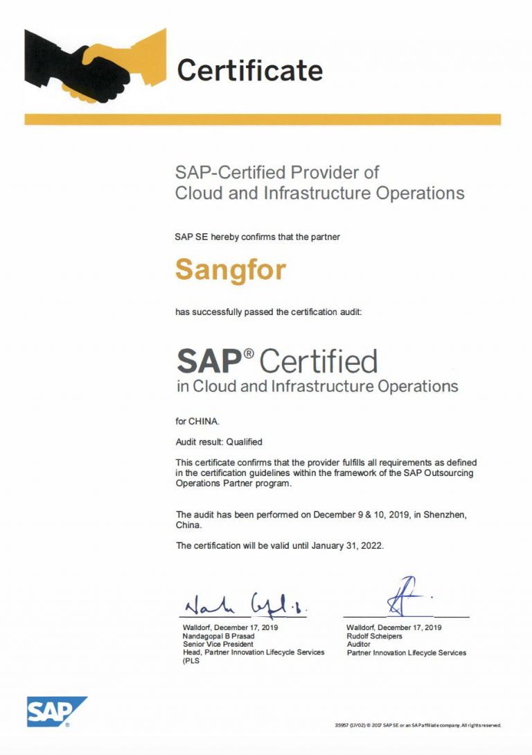 由SAP主导对深信服作为SAP HANA运营、云和基础设施运营提供商的全面评估及审计过程中,深信服云计算以标准的产品架构、服务交付、项目质量管理和运营持续改进等优势顺利通过数百条审计项。