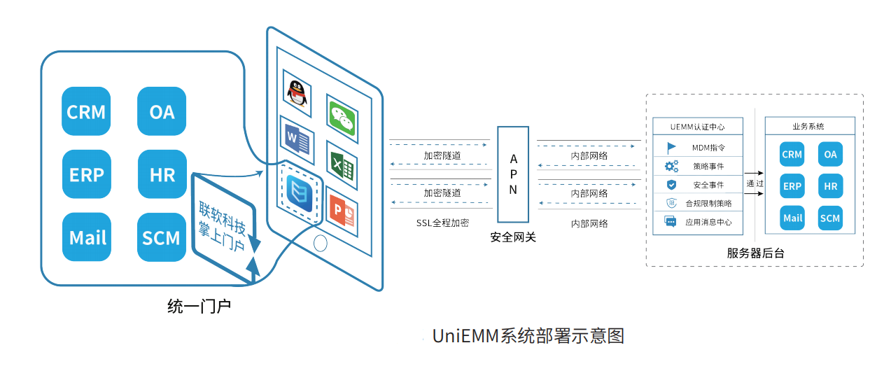 UniEMM企业移动安全管理平台为企业提供一整套移动应用安全框架,它采用先进的“零信任”安全架构设计理念,为企业应用提供安全便捷的部署环境,解决企业数据在传输、存储、使用、设备遗失等各种场景下的安全问题;通过接入UniEMM统一门户与安全隧道,防止黑客入侵后端系统,比传统VPN更加安全。通过统一安全策略,解决员工隐私保护问题,防止第三方移动应用开发商窃取员工隐私信息。
