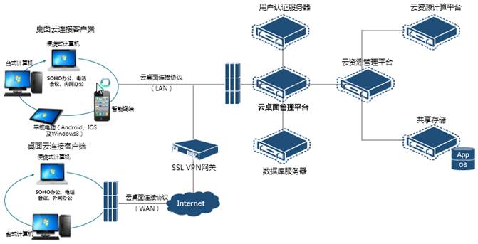 H3Cloud云桌面方案基于业界主流的虚拟桌面基础架构(VDI,Virtual Desktop Infrastructure,虚拟桌面基础架构),它融合了企业级服务器与虚拟化平台产品的功能和优势,能够将用户的桌面环境以虚拟机的形式托管到数据中心内的高性能服务器上。管理员可以实现对所有云桌面资源进行可视化的便捷管理,快速地批量部署云桌面满足大量用户的需求等操作。用户可以通过PC、瘦客户机等多种终端使用自己的云桌面,方便地完成日常办公、教学、管理等任务。同时,H3Cloud云桌面还可以和UIS、分布式存储等方案结合,为用户带来高密部署、平滑升级等众多应用价值。